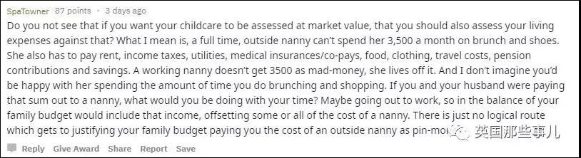 保姆不會有3500美元的零花錢,她得靠這錢生活。而且,假如保姆像你那樣花時間去吃早午餐,去買東西,我覺得你肯定不會高興的。如果你和你丈夫花錢僱保姆,那你怎麼安排自己的時間呢?