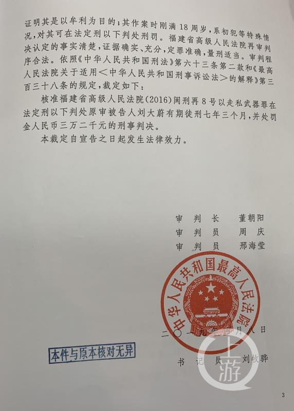 5月25日,18歲少年劉大蔚網購仿真槍被判無期案辯護律師徐昕發佈消息稱,已收到最高人民法院《刑事裁定書》,核准福建省高級人民法院(2016)閩刑再8號以走私武器罪在法定刑以下判處劉大蔚有期徒刑7年3個月,並處罰金32000元的刑事判決。