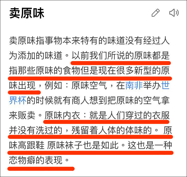先看一下百度大神怎麼解釋“原味”這個詞兒:以前“原味”指原味的食物,但現在很多新型的“原味”出現,如“原味內衣”,就是人們穿過並沒有洗過的貼身衣物,而殘留着人體體味,原味高跟鞋、原味襪子也是如此,這是一種戀物癖的表現。