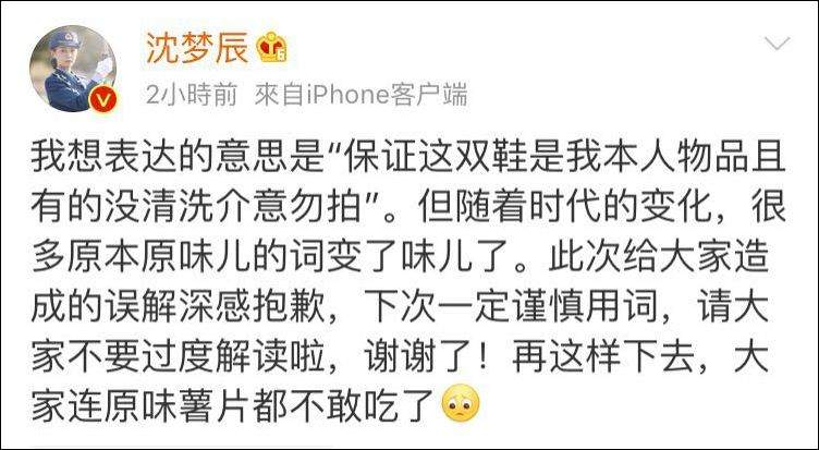 然後,受網友議論的沈夢辰27日發微博響應,稱自己的意思是保證這雙鞋是本人的,希望大家不要過度解讀,是時代的變化令這個字的意思也產生了變化,同時對自己沒有謹慎用詞感到抱歉——