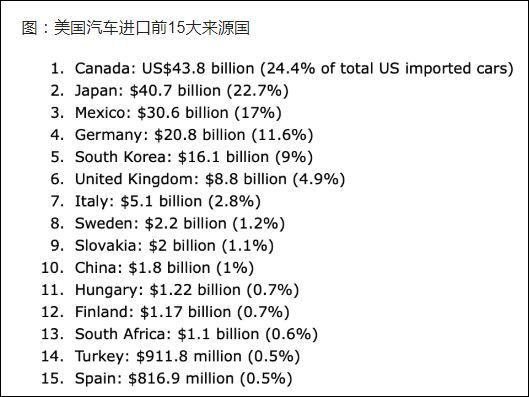 根據最近的數據顯示,2017年美國汽車進口總額約為2000億美元,佔進口總額超過8%。其中,歐盟成員國德國、英國、意大利、瑞典、斯洛伐克、匈牙利、芬蘭、西班牙都在美國前15大進口汽車來源國之列,總比例達到23.5%,僅次於加拿大(24.4%),高於日本(22.7%)。