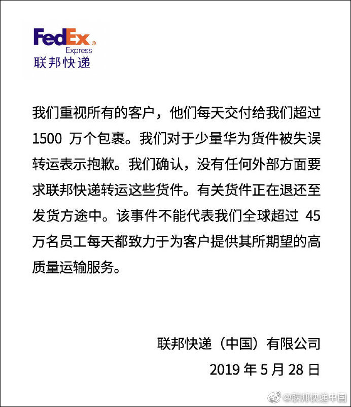 @聯邦快遞中國 5月28日發佈消息,我們重視所有的客户,他們每天交付給我們超過1500萬個包裹。我們對於少量華為貨件被失誤轉運表示抱歉。我們確認,沒有任何外部方面要求聯邦快遞轉運這些貨件。有關貨件正在退還至發貨方途中。該事件不能代表我們全球超過45萬名員工每天都致力於為客户提供其所期望的高質量運輸服務。