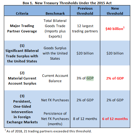 美國財政部最新評估一個國家是否在操縱其匯率有三個標準:與美國貿易順差超過200億美元;該經濟體的經常賬户順差佔國內生產總值(GDP)的比重至少為2%;該經濟體反覆購匯的單向干涉在過去十二個月中至少維持了一半時間,同時淨購彙總量至少佔GDP2%。