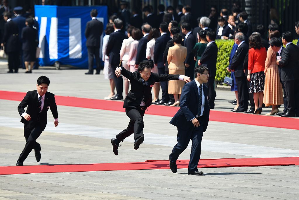 特朗普訪日小花絮:工作人員跳着跨越紅毯 2019-05-29 (觀察者網 訊) 特朗普本次訪日期間,攝影記者Brendan Smialowski拍下了一個小花絮。 本週一,特朗普赴皇宮會見日本天皇。特朗普抵達前,幾名工作人員為了不弄亂剛剛整理好的紅地毯,紛紛從上面跳過去。 (視覺中國 圖)
