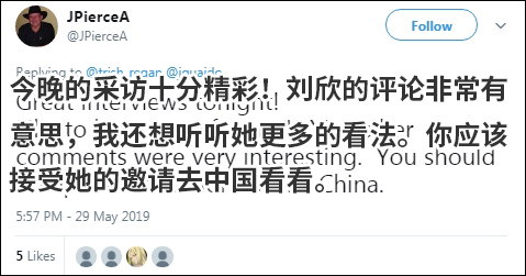 在近16分鐘的直播裏,翠西提出一系列犀利的問題,而劉欣則代表個人紛紛予以耐心、沉着的回答。原先鼓吹中美(經濟)“必有一戰”的翠西,也在節目末尾承認,貿易戰“對誰都沒好處”。