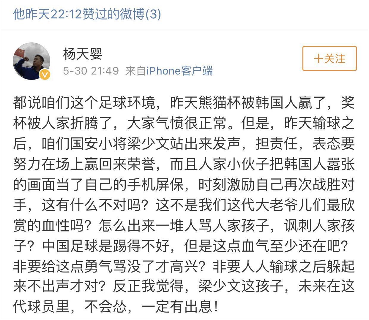 當晚,微博認證為《中國體育報》體育產業部副主任的@楊天嬰 發文怒斥:中國足球是踢得不好,但球員們的血氣還是在的,難道大家非要把這點勇氣罵沒了才高興?
