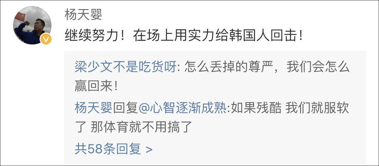 梁少文點讚了@楊天嬰 的這條微博,並再次回應:怎麼丟掉的尊嚴,我們會怎麼贏回來,他還在回覆網友的評論中表示:如果殘酷,我們就服軟,那體育就不用搞了。