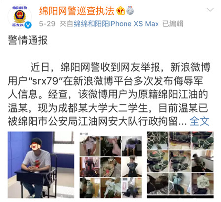 (觀察者網訊)5月29日,綿陽市公安局網絡安全保衞支隊官方微博@綿陽網警巡查執法 發佈警情通報稱,近日,綿陽網警收到網友舉報,新浪微博用户“srx79”在新浪微博平台多次發佈侮辱軍人信息。經查,該微博用户為原籍綿陽江油的温某,現為成都某大學大二學生,目前温某已被綿陽市公安局江油網安大隊行政拘留。