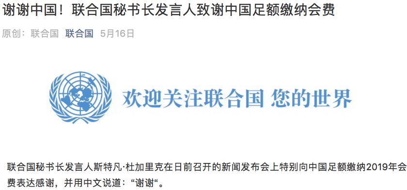 目前,中國已足額承擔聯合國常規預算分攤的12.01%。據聯合國官方微信消息,秘書長發言人斯特凡·杜加里克在5月召開的新聞發佈會上特別向中國足額繳納2019年會費表達感謝,並用中文説:“謝謝”