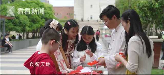 廣場一側,小朋友們圍在花樣經藝人旁學剪紙