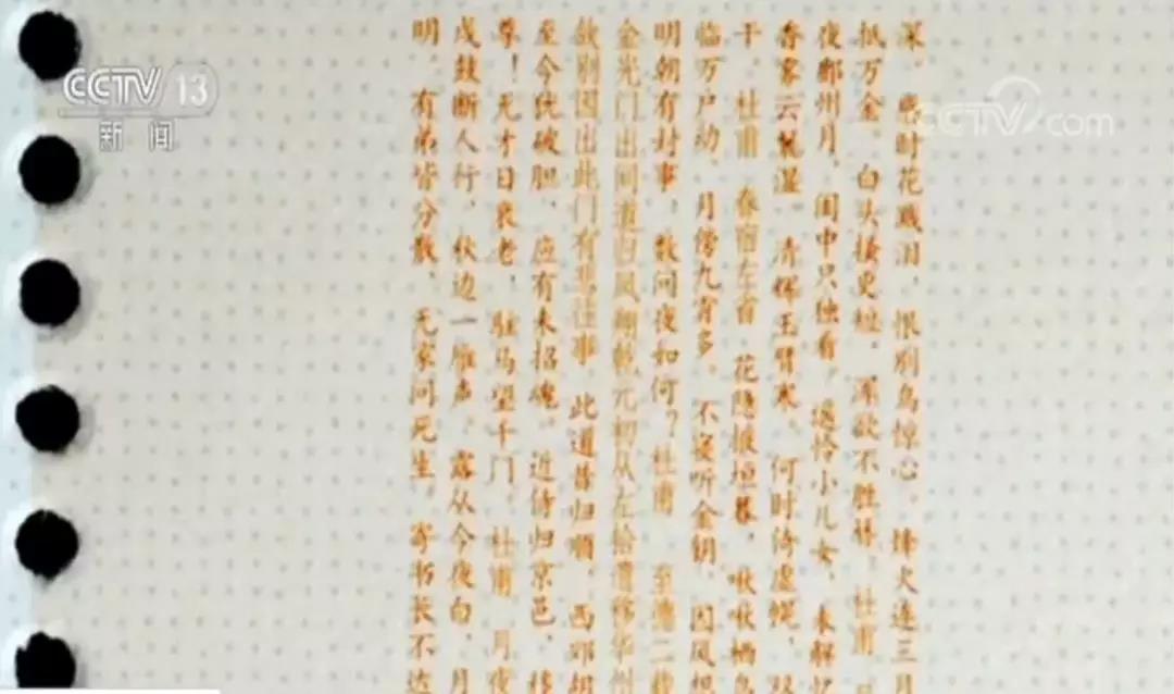周邊一個個方塊裏面密密麻麻有些點、線的概念。用放大鏡後看到的其中一首杜甫很有名的詩句,描寫當時唐代社會的場景,烽火連三月,家書抵萬金。這一個套票的小版張,形成一張郵票一部書的概念。