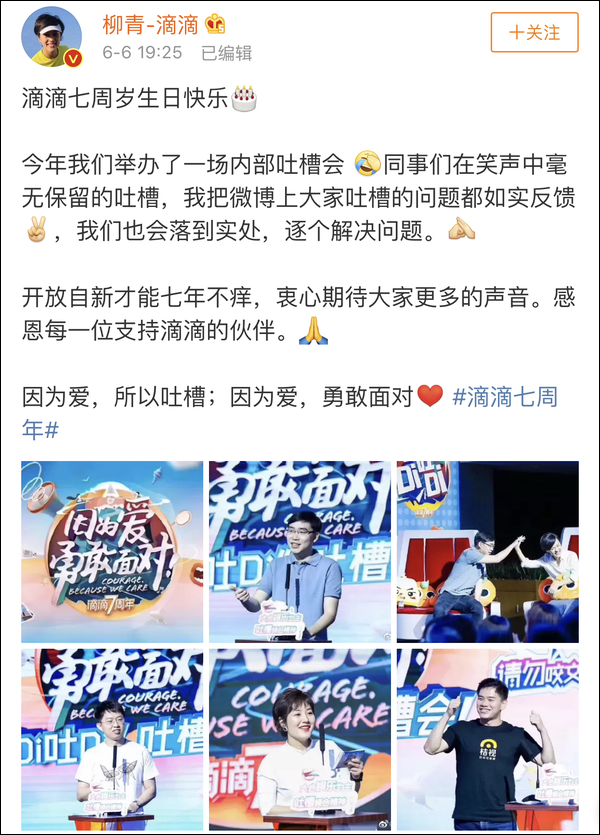 6月6日,滴滴出行在七週年生日之際,舉辦了一場公司內部吐槽會。今天(11日),滴滴出行總裁柳青在個人微博上發佈了一段吐槽會後續視頻,展現了當時“唇槍舌戰”的情景。