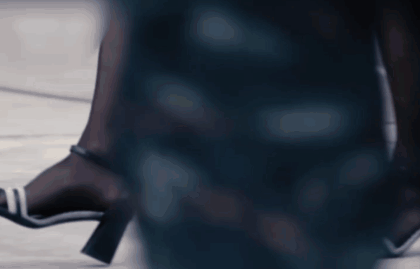 戴上栗色波浪卷假髮,穿上絲襪短裙,還有一字肩黑上衣,腳蹬高跟皮涼鞋。