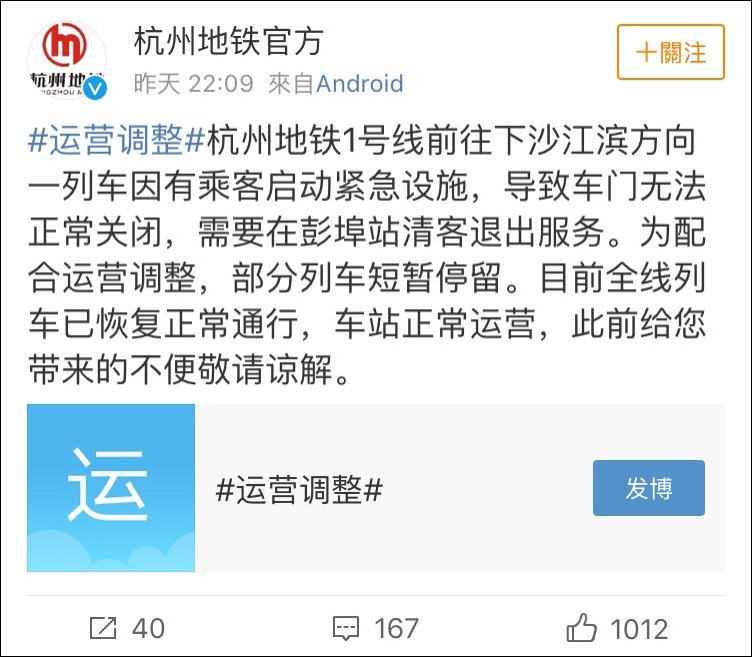 當天晚上10點多,杭州市地鐵集團官方微博@杭州地鐵官方 回應此事: