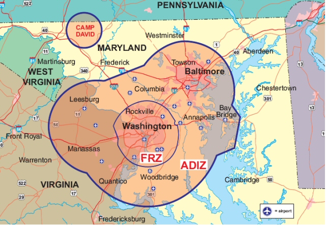 2003年2月,美國聯邦航空管理局(FAA)在華盛頓大都會地區上空設立防空識別區(ADIZ),以羅納德·里根國家機場為圓心,涵蓋約4700平方公里的空域,非法闖入的飛行器將被軍機攔截。“限制飛行區”位於ADIZ之內,半徑24到28公里。