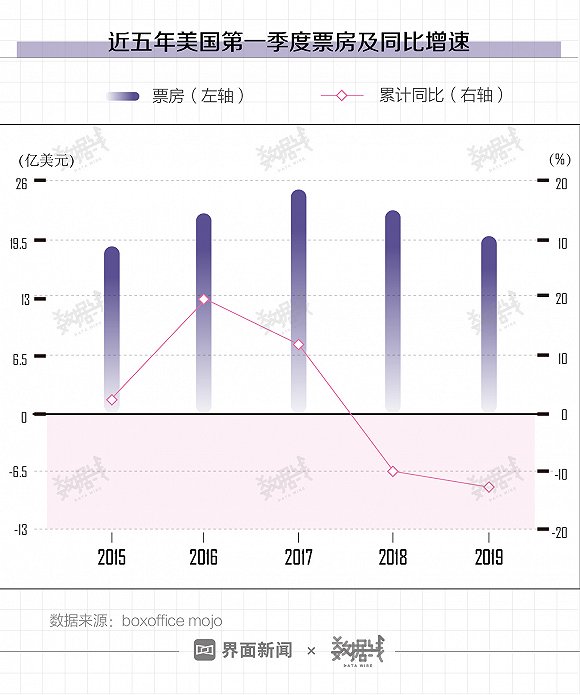 根據Box Office Mojo數據,2019年第一季度,美國票房同比下降12.6%,已經連續兩年下滑。