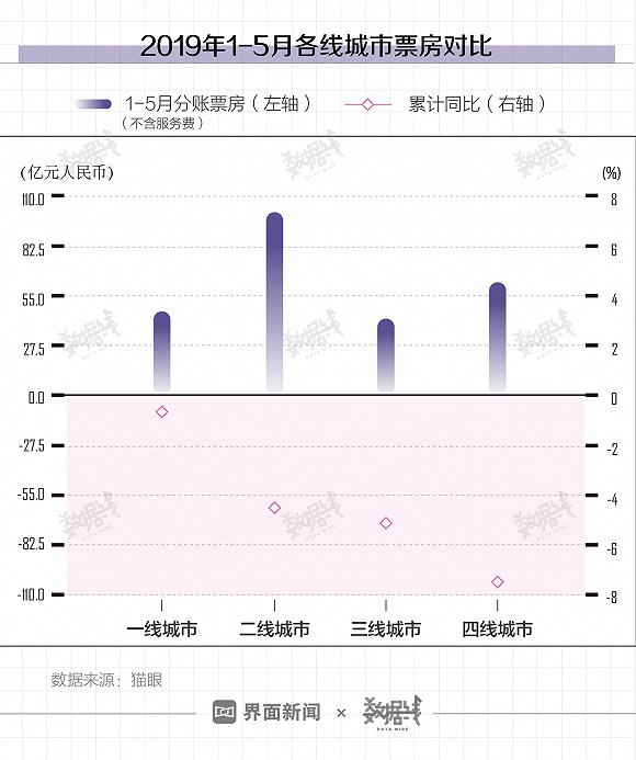 據界面新聞6月14日報道,據貓眼數據,2019年1-5月中國電影分賬票房(不含服務費)和觀影人次的同比增速均為負,出現2011年來首次下降。