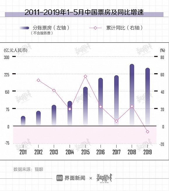據貓眼數據,2019年1-5月中國電影分賬票房(不含服務費)和觀影人次的同比增速均為負,出現2011年來首次下降。