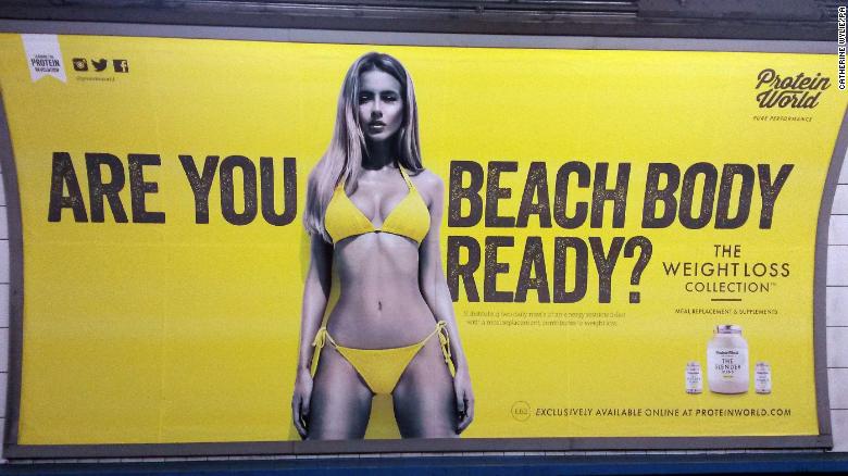 英國地鐵裏還曾出現某減肥產品的廣告:一個瘦女孩穿着比基尼,背後寫着“Are you beach body ready? ”——“準備好你的沙灘身材了嗎?”