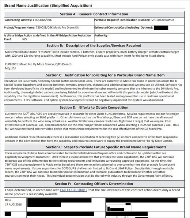 而美國空軍2018年8月公佈的一份採購文件顯示,美國空軍還將採購35架中國大疆公司的商用無人機,型號為Mavic Pro鉑金版。美國空軍表示,從功能,購買和運用成本等方面考慮,其他品牌的類似平台都無法滿足需要。