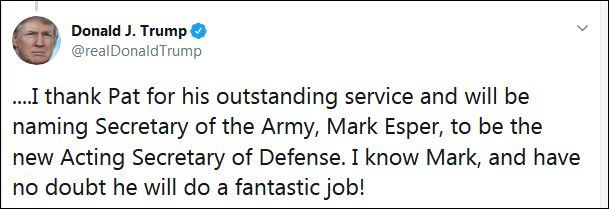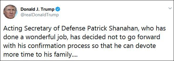 當地時間6月18日,美國總統特朗普在推特上宣佈:美國代理國防部長沙納漢已決定不再繼續他的提名確認程序,以便有更多時間與家人在一起。特朗普對沙納漢的“卓越工作”表示感謝,並表示將任命陸軍部長埃斯珀擔任新的代理國防部長。