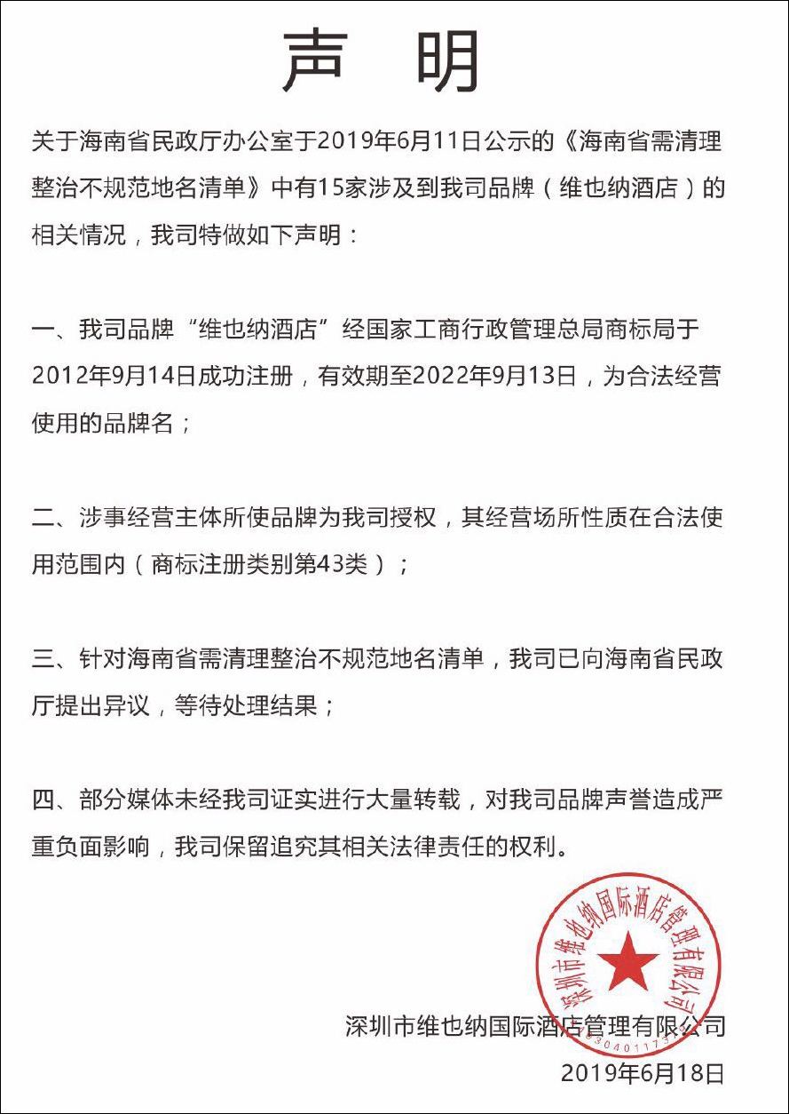 18日,維也納酒店在官網和官方微博發佈聲明,表示針對海南省需清理整治不規範地名清單,已向海南省民政廳提出異議,等待結果。