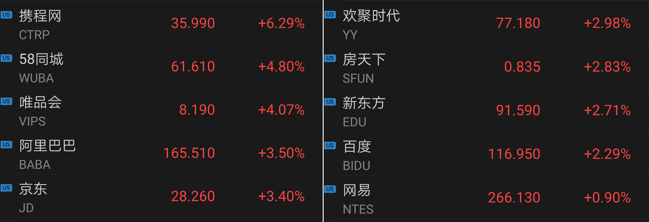 受消息影響,之前最受中美貿易摩擦陰霾影響的美國芯片股和中概股大漲: