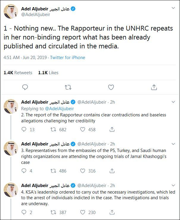 當天沙特時間的午夜(北京時間20日4時51分左右),沙特外交大臣朱拜爾連發7條英文推特,駁斥該報告。