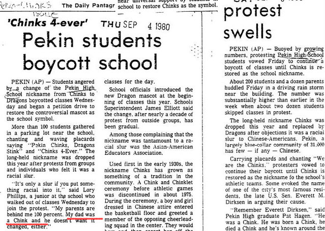 還有件趣事,值得一提。北京社區高中(PCHS)的校隊俗稱“北京中國佬”,對,就是那個現在被視為種族歧視的“Chink”。從1930年代起就是叫這個名,直到1980年暱稱才從“Pekin Chinks”變為“Dragons”,但有些校友至今仍反對改名。