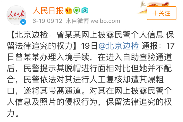 根據觀察者網此前報道,17日下午,曾軼可發帖,怒稱在北京首都機場遭到某邊檢人員刁難,指其蠻不講理私用職權,隨後更以“九宮格圖片”形式曝光該人員的證件照片。