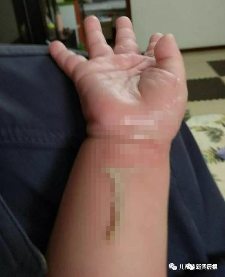 童童被熱米線燙傷了,總燙傷面積有半個巴掌那個大,又紅又腫。