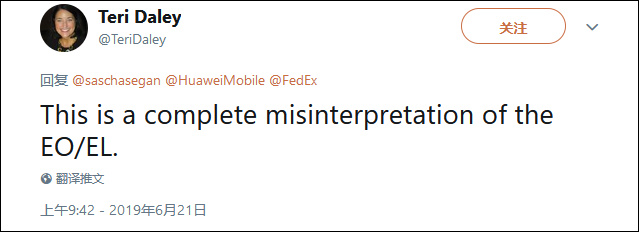 在塞根首次發佈推文後,華為美國公司發言人泰瑞·戴利(Teri Daley)便回覆推文稱,聯邦快遞拒投遞華為手機,“這完全是對(美國)行政命令和實體名單的誤讀。”