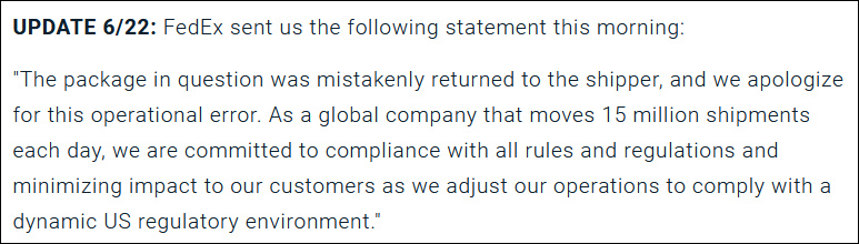 “正被討論的包裹是被錯誤地退還給發件人,我們對此錯誤操作道歉。作為一家日吞吐量1500萬件的全球性企業,我們致力於在遵守所有規則的條件下,減少由遵從動態變化中的美國監管政策給客户造成的衝擊。”
