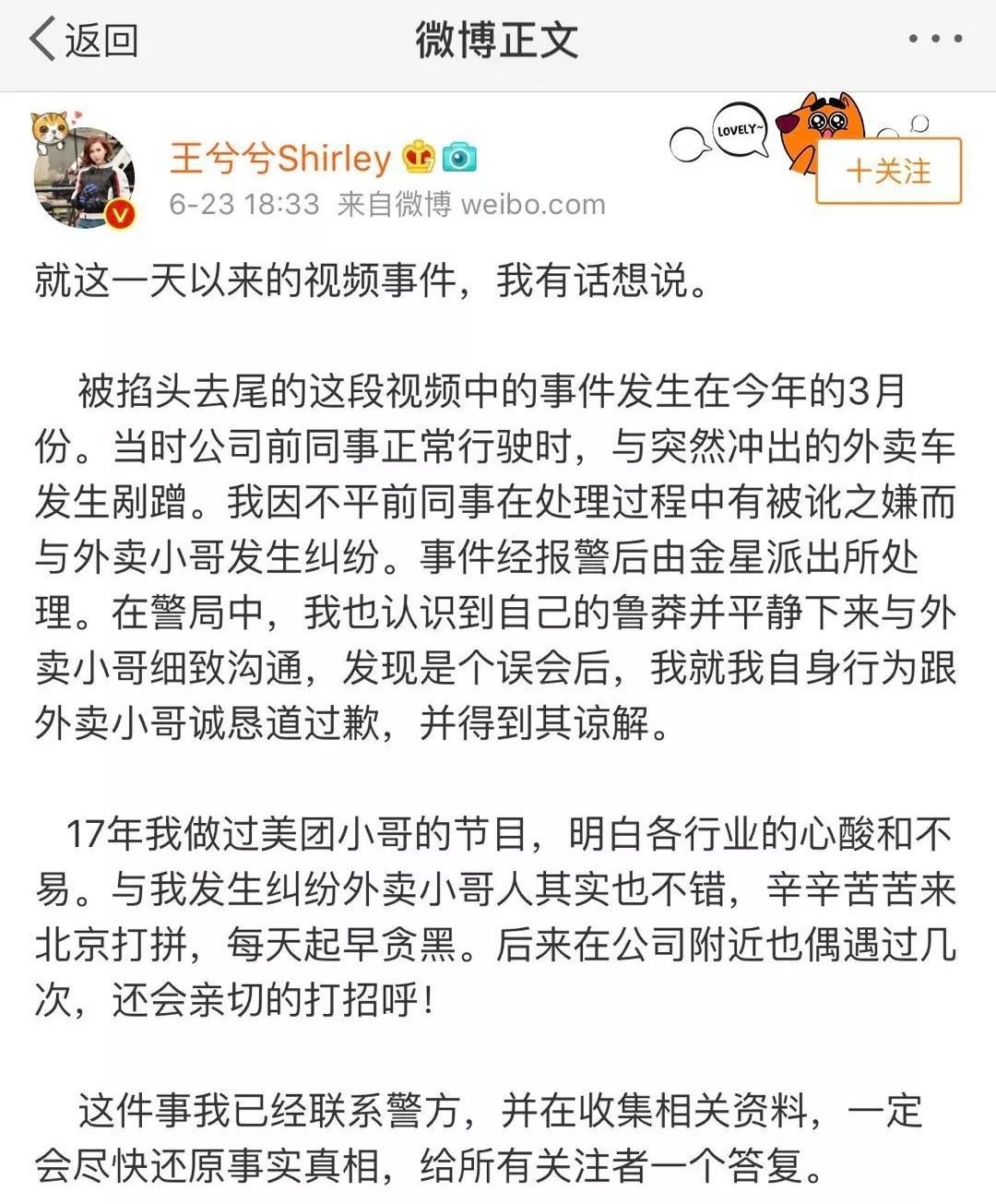 打人博主回應6月23日晚,視頻事件中的女子@王兮兮Shirley發文回應了該視頻內容。她稱,事件發生在今年3月,當時她的同事正常行駛與突然衝出的外賣車發生剮蹭,因不滿同事被訛引發糾紛。後經警方調解,已向外賣小哥道歉。現在該博主已聯繫警方,承諾儘快還原真相。