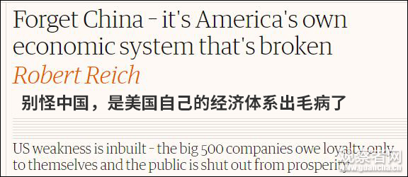 英國《衞報》在6月23日刊登了美國前勞工部長羅伯特·賴克的文章《別怪中國,是美國自己的經濟體制出毛病了》。這篇文章表示,中方不會同意美國所要求的的“改變經濟體制”,因為根本沒有理由要改。文章分析了中美兩國經濟體制的差別,認為美國不應該把“鍋”都甩給中國,要從自己的經濟體制找原因。