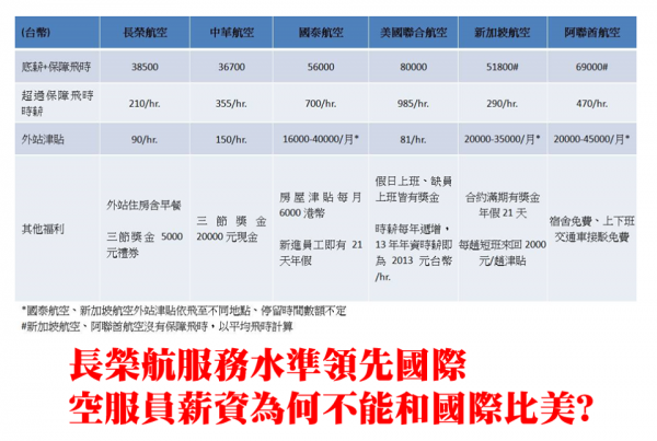 工會製作的長榮航空與其他航空公司工資待遇對比圖,需要説明的是該表未將年終獎納入統計