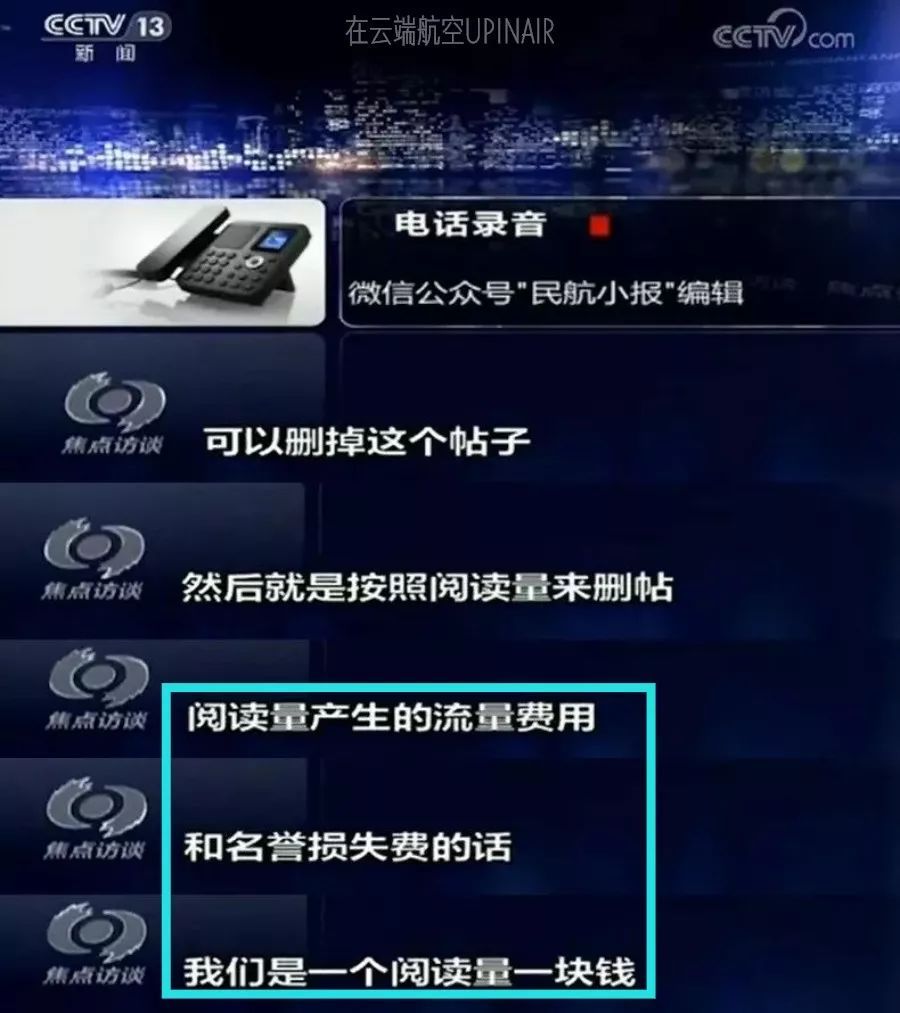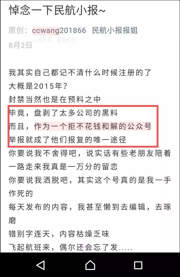 同時,有網友爆料稱,“民航小報報姐”的前身其實是被封號的“民航小報”。據央視網此前報道,微信公眾號“民航小報”曾被《焦點訪談》節目點名有“花錢購買閲讀量”的行為。2018年8月2日,“民航小報”被封禁之後,備用號“乘務員”更名為“民航小報報姐”。