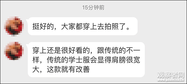 雖然在網絡上受到了不少爭議,一位廈門工學院的學生告訴觀察者網,學生們對學位服都還蠻喜歡的,並且穿上也很好看。