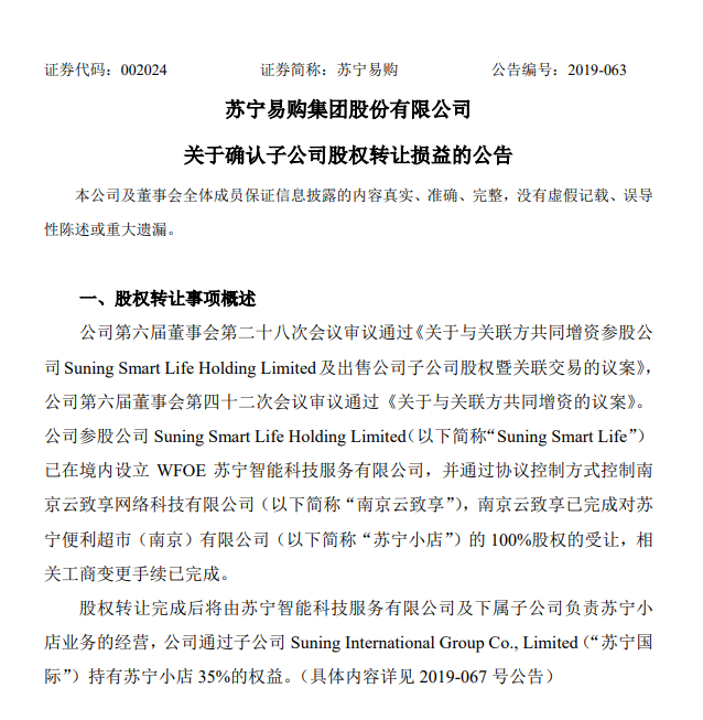 股權轉讓完成後將由蘇寧智能科技服務有限公司及下屬子公司負責蘇寧小店業務的經營,公司通過子公司 Suning International Group Co., Limited(“蘇寧國際”)持有蘇寧小店35%的權益。