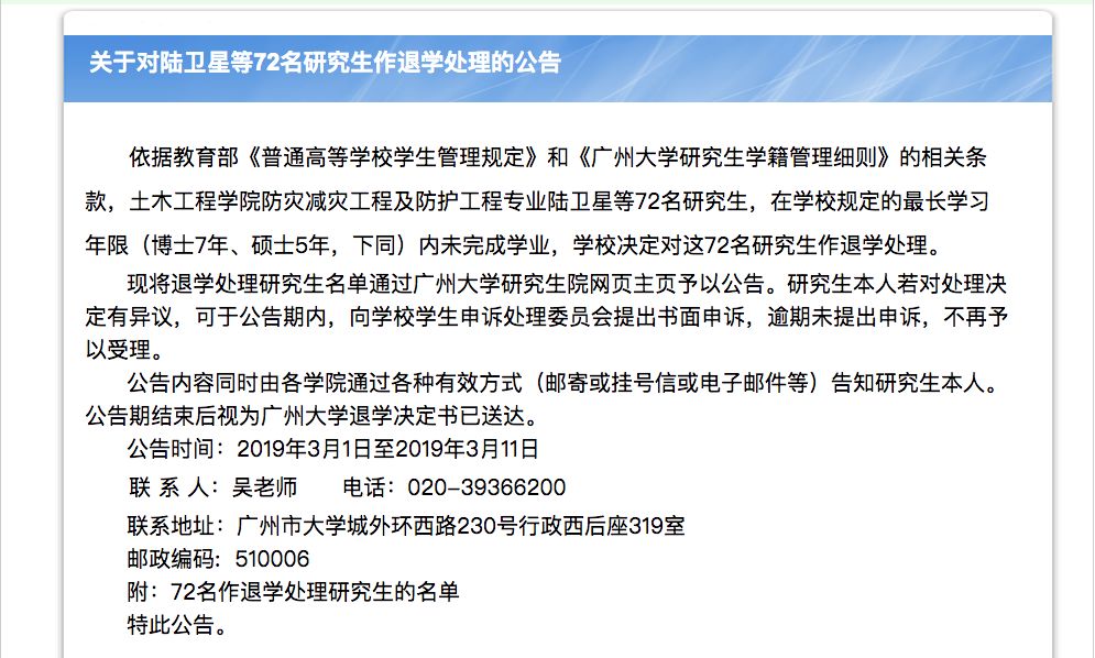 公告稱,清華大學擬對這兩名博士研究生作出予以退學處理,由於難於聯繫到學生,無法直接送達本通知,特予公告送達。