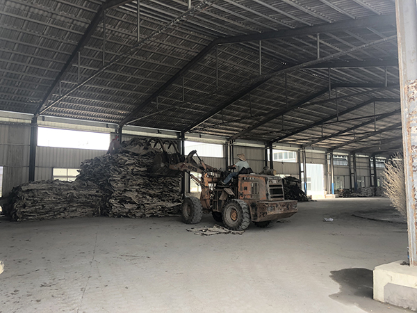 華誠公司倉庫內,工人正在用剷車搬運驢皮。
