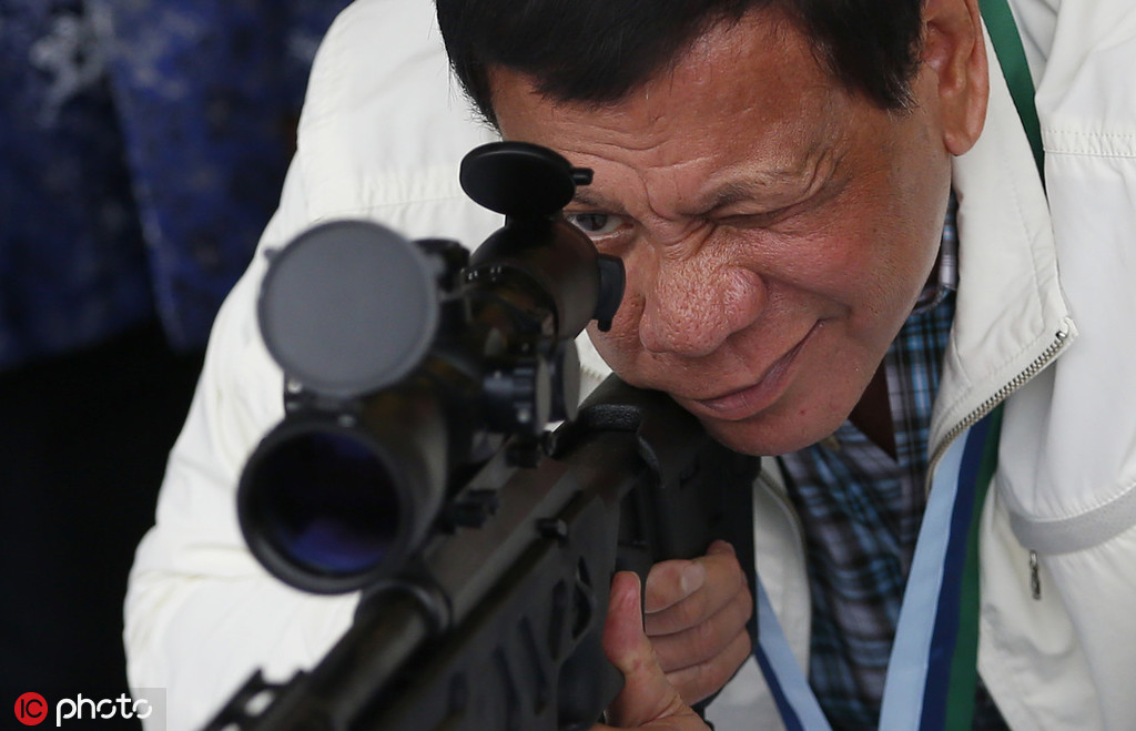 2017年6月28日,杜特爾特在克拉克空軍基地查看中國捐贈的7.62毫米高精度狙擊步槍 @IC Photo