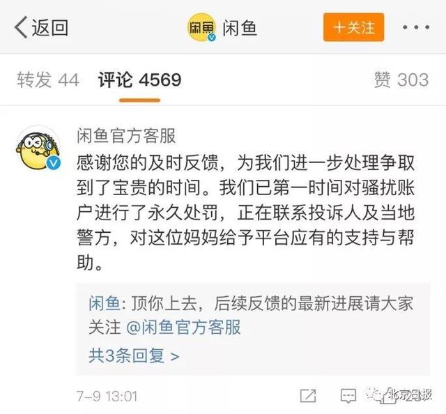 針對此事,7月9日13時許,@閒魚官方客服 回應:我們已第一時間對騷擾賬户進行了永久處罰,正在聯繫投訴人及當地警方,對這位媽媽給予平台應有的支持與幫助。