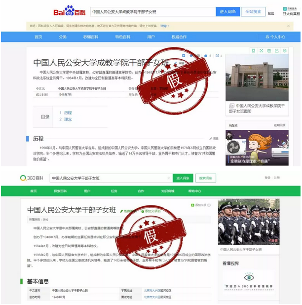 隨着本科招生工作的開展,“幹部子女班”等名號的欺詐宣傳又捲土重來,甚至利用百度詞條、360百科等平台發佈虛假信息,不明真相的考生很容易信以為真。但假的就是假的,對照招生章程稍加區別,騙子的意圖便原形畢露。