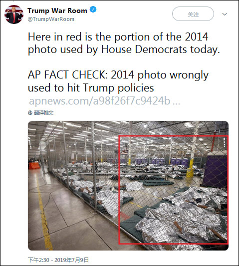 他們在另一條推文中直接引述了美聯社2018年5月的報道,“這些照片是美聯社在2014年奧巴馬執政時期拍攝的,但現在有些自由派活動人士似乎是在拿這些照片來攻擊特朗普的移民政策。”