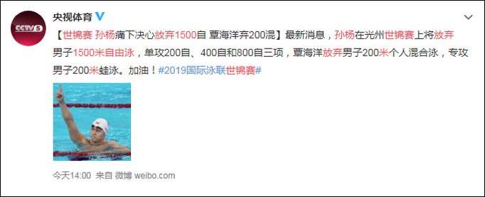 據北京晚報報道,7月11日上午,在CCTV體育新聞播報裏,確認瞭如下事實:孫楊在光州世錦賽上放棄男子1500米自由泳,單攻200自、400自和800自三項,覃海洋放棄男子200米個人混合泳,專攻男子200米蛙泳。這是一個理論上兩年前就該出現的選擇!好在,兩年後它終於出現了也不算晚。精神掛帥退位,現實考量第一!
