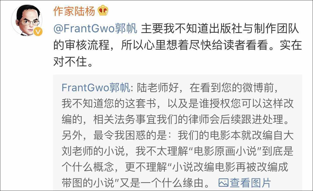隨後,他又現身郭帆的微博評論區道歉,稱不知道出版社和製作團隊的審核流程,“心裏想着儘快給讀者看,實在對不住”。