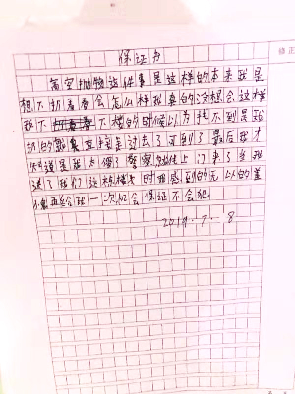 7月10日,拋下滅火器的男孩及其家屬寫下道歉信和保證書,貼在事發樓棟3個單元門口,向業主道歉。根據業主提供的保證書顯示,他解釋了高空拋物的原因,本來他是想看看扔下滅火器會怎麼樣,男孩認為別人無法查明是他扔的。最後表示,他希望業主再給一次機會,並保證不會犯。落款為2019年7月8日。