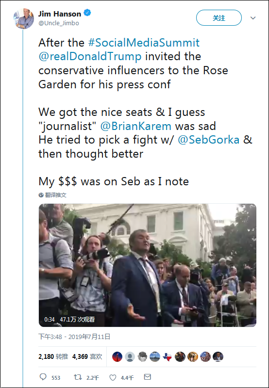 保守派人士吉姆·漢森(Jim Hanson)隨後在推特上放出了完整視頻,並表示白宮當天將保守派全部安排到了前排位置,而身為白宮記者的卡仁只能坐在後排,這樣的安排引起了他的不滿。卡仁之所以大喊大叫,只是為了“坐個好位置”。