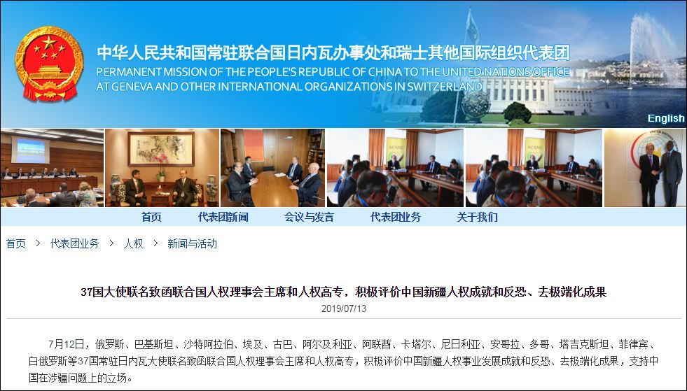 兩天後,12日,俄羅斯、巴基斯坦、沙特阿拉伯、埃及、古巴、阿爾及利亞、阿聯酋、卡塔爾、尼日利亞、安哥拉、多哥、塔吉克斯坦、菲律賓、白俄羅斯等37國常駐日內瓦大使聯名致函聯合國人權理事會主席和人權高專,積極評價中國新疆人權事業發展成就和反恐、去極端化成果,支持中國在涉疆問題上的立場。